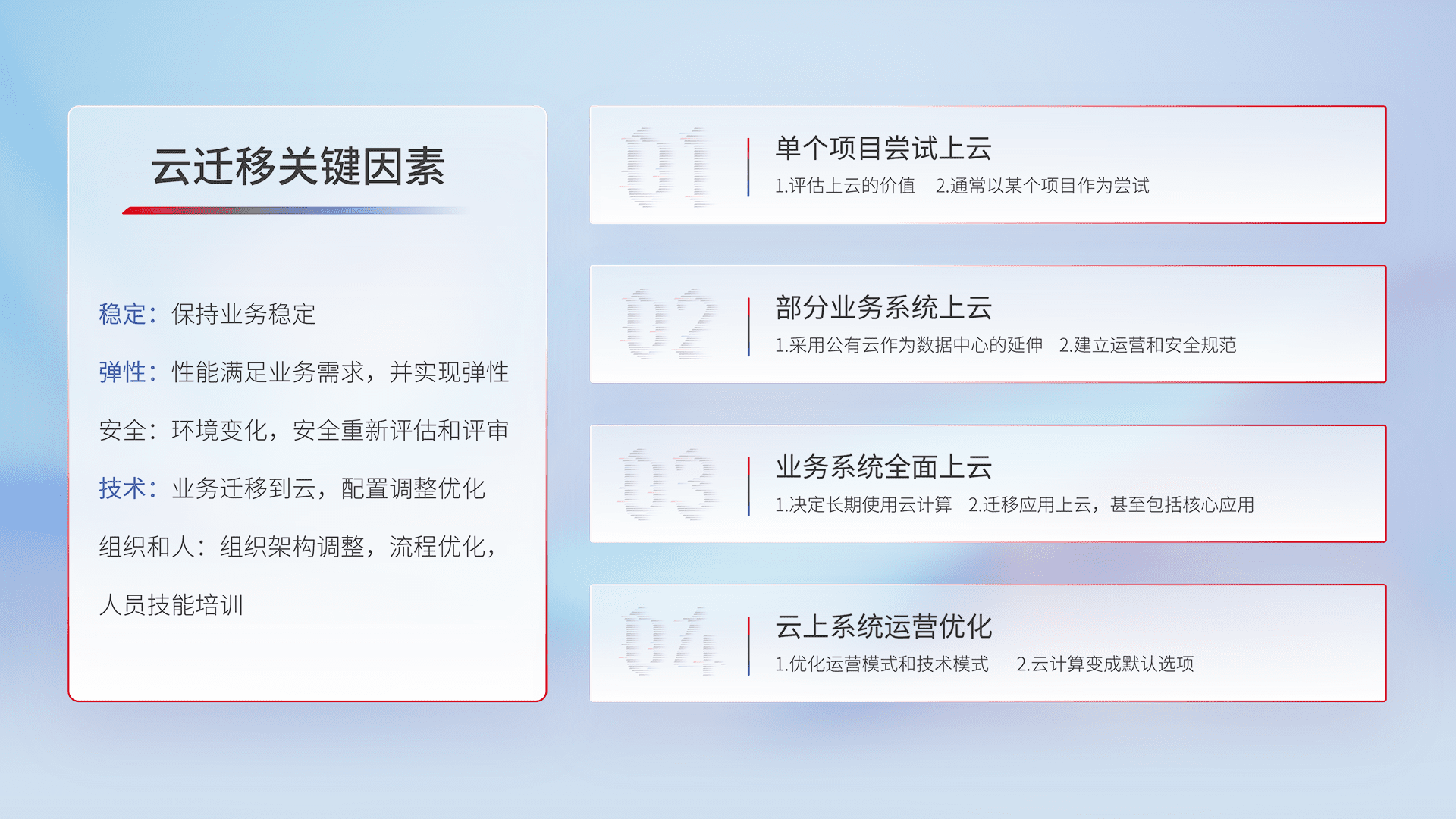 结合实际业务,,从规划设计、、、云平台选型、、云原生改造、、、、数据迁移、、、集成交付,,迁移全过程为客户识别最佳上云路径,,,,做好风险识别管理,,,,设计网络架构、、身份权限、、、安全审计合规、、、、操作审计、、日志审计、、、、监控告警策略、、、多站点容灾设计等,,,,对云上基础设施进行整体规划,,,,提升IT治理水平,,以满足弹性、、高可用、、、、高性能的需求。。。